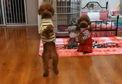 一只泰迪擅长跳跃,另一只泰迪擅长转圈。最后轮到小灰泰迪出场了,小泰迪还没有学什么特殊技能。但是初生牛犊不怕虎,小泰迪也不是省油的灯。只见小泰迪来了一招三条腿走路,狗狗一只前爪高高的举起,整个身体开始蹦,主人一看当时就笑翻了。