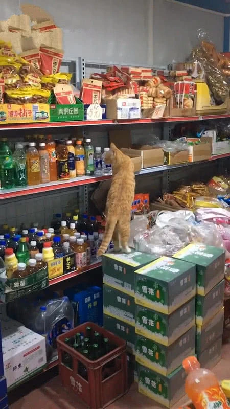 这位铲屎官自从开了超市之后,家里的橘猫就改变了行动场所。以前橘猫就喜欢窝在家里,大门不出二门不迈。自从猫咪知道超市有好吃的零食之后,猫咪直接把超市当成了自己的大本营。橘猫每天最喜欢转悠的地方,就是摆放火腿的区域。
