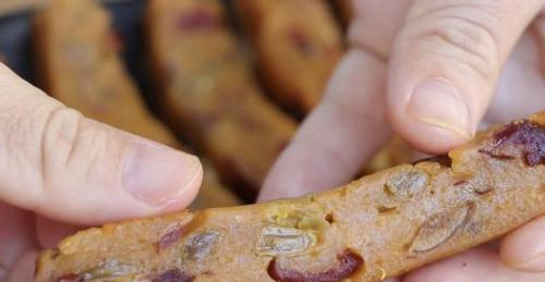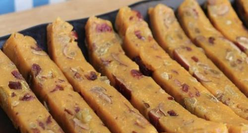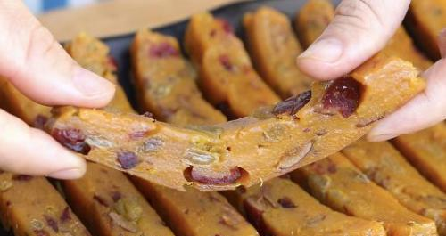 【红薯蜜糕条】准备食材:红薯、木薯粉、葡萄干、蔓越莓、红枣、食用油、黄油、麦芽糖
