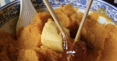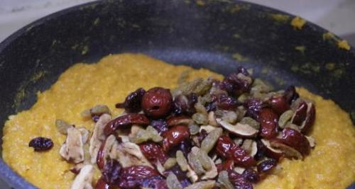 第四步:待红薯蒸熟后,端出,倒进一个大碗中,用勺子将其碾成泥,加入黄油、麦芽糖拌匀,接着倒入炒锅中,小火炒至,带黄油和麦芽糖完全融化,再倒入刚才勾芡好的水淀粉,接着放入刚才备好的那一碗果干,将其和匀。