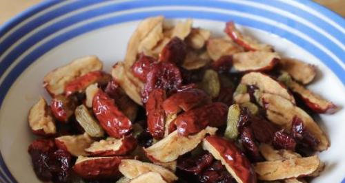 第二步:趁着蒸红薯的这个时间段,将葡萄干、蔓越莓和红枣清洗干净,红枣去核切成小块状,然后将这些材料全部装入到一个碗中。