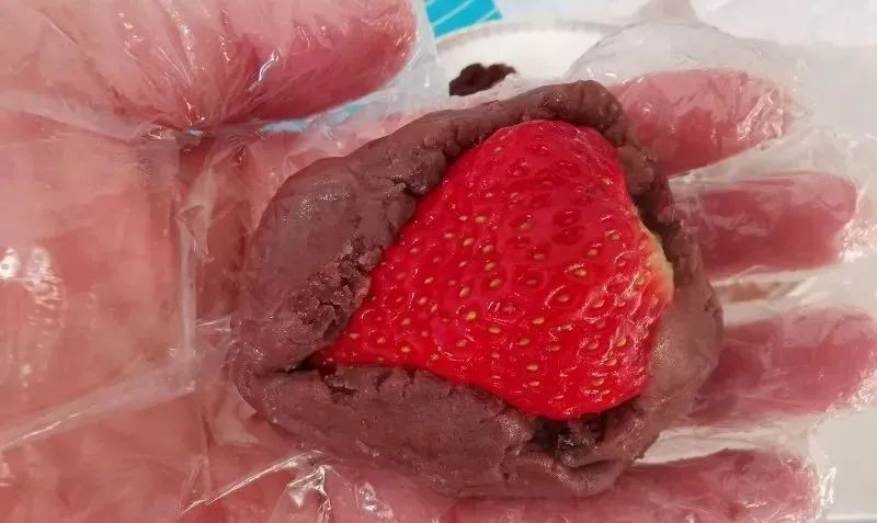12. 包裹住豆沙草莓,滚上熟米粉防粘。