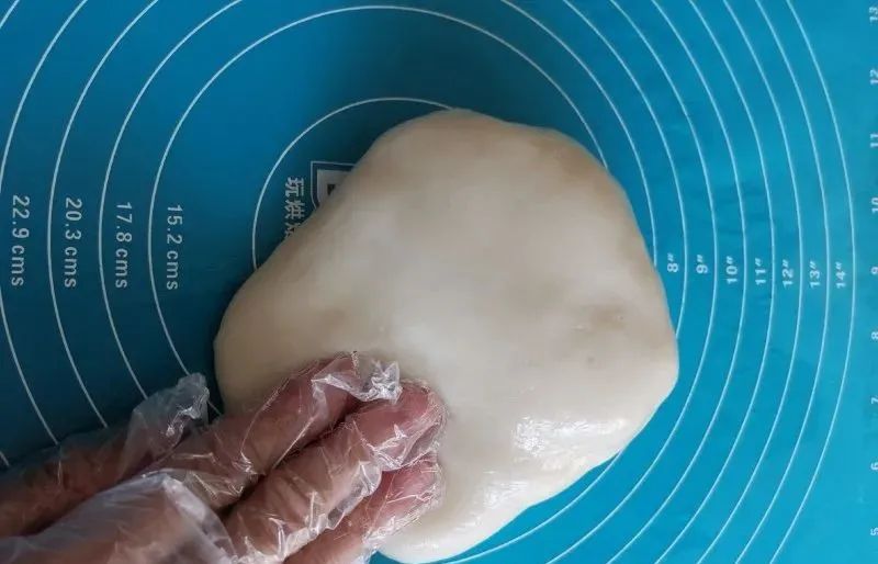 6. 晾至温热时,分次加入软化的黄油,反复的柔搓揉匀,盖好放置一会凉透。