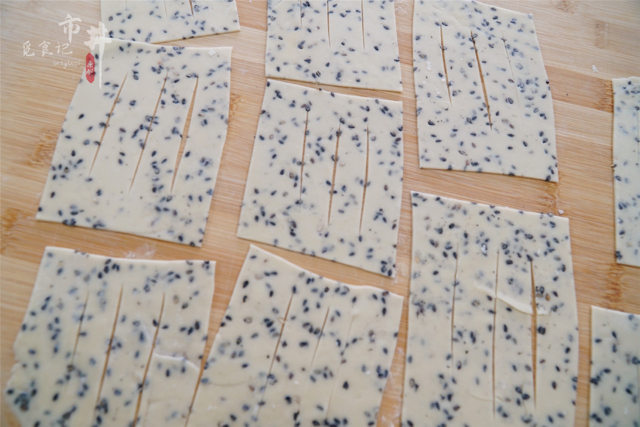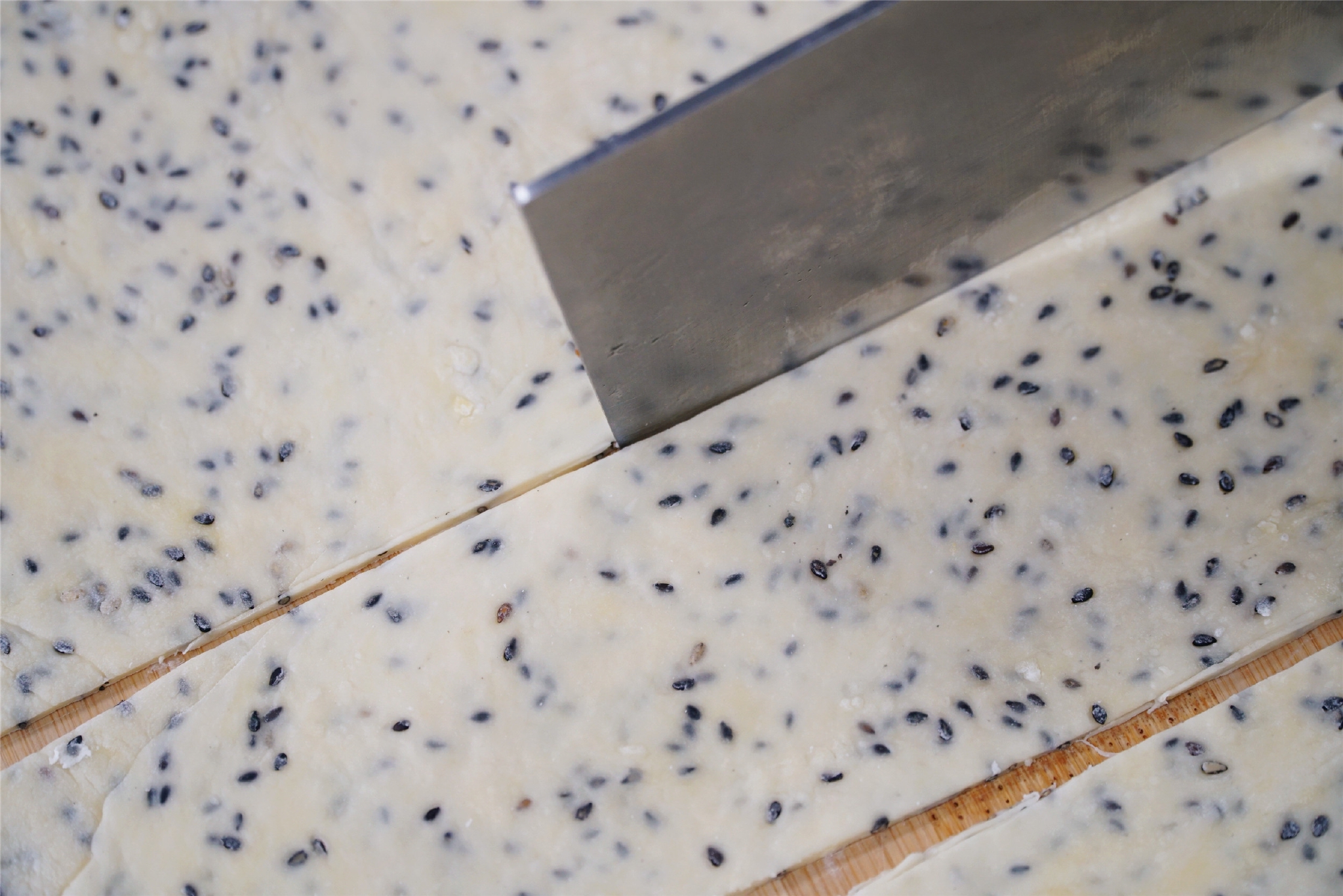5、长方形的面片中间划上三刀,不要整个切开,两边留有缝隙,这样炸出来的麻叶就可以很自然的卷曲了。