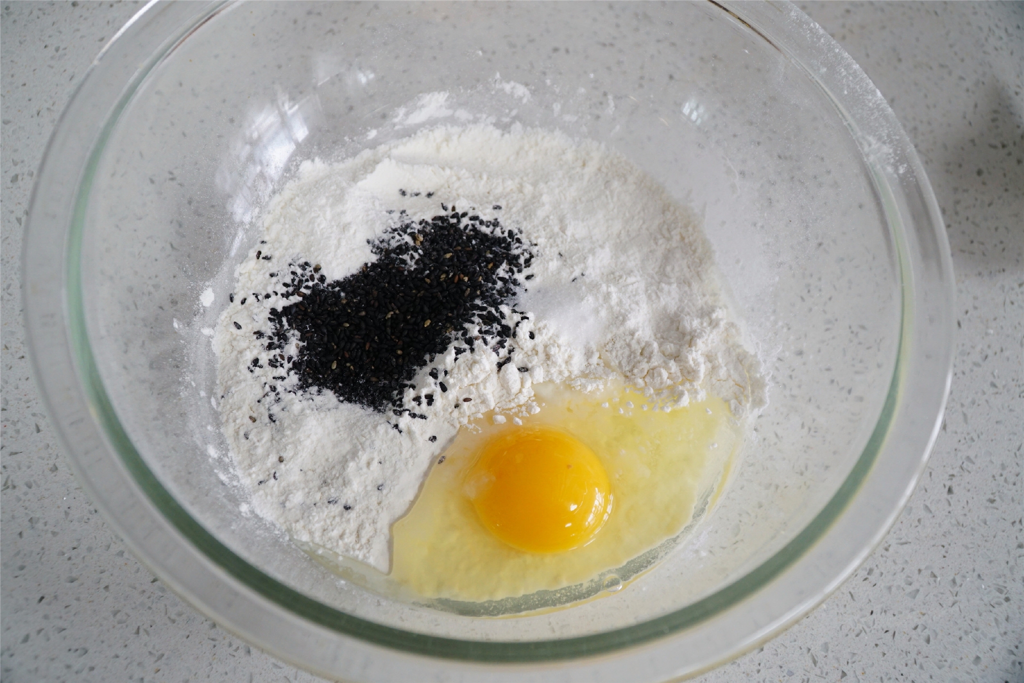 所需食材:面粉200克,鸡蛋1个,少许黑芝麻