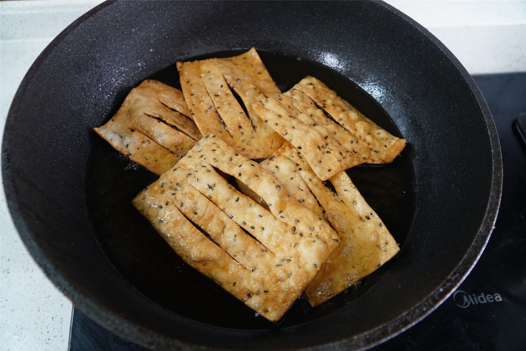 6、锅内倒入宽油,待油七成热,切好的面片放入锅中,保持中火油炸。
