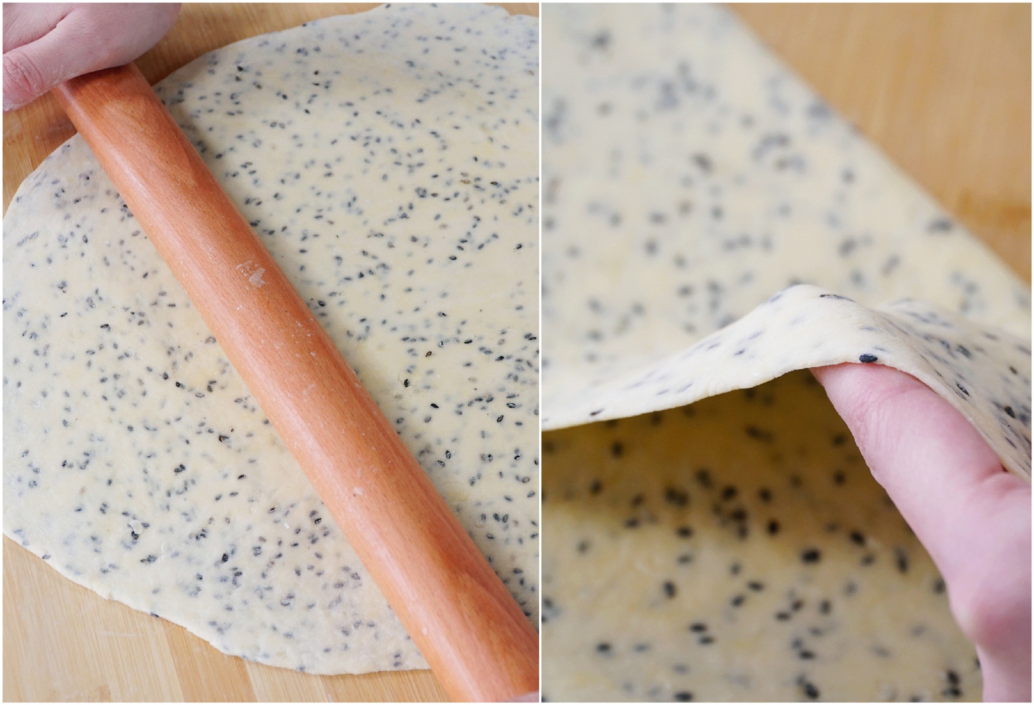 3、面团拿到案板上,用擀面杖擀开,擀成1mm厚的薄片,特别是中间的面皮要和四边一样厚,麻叶要尽量的薄,越薄越酥脆。