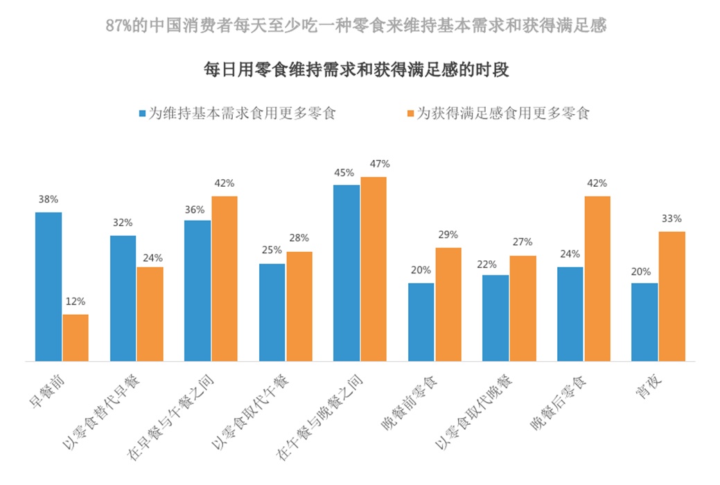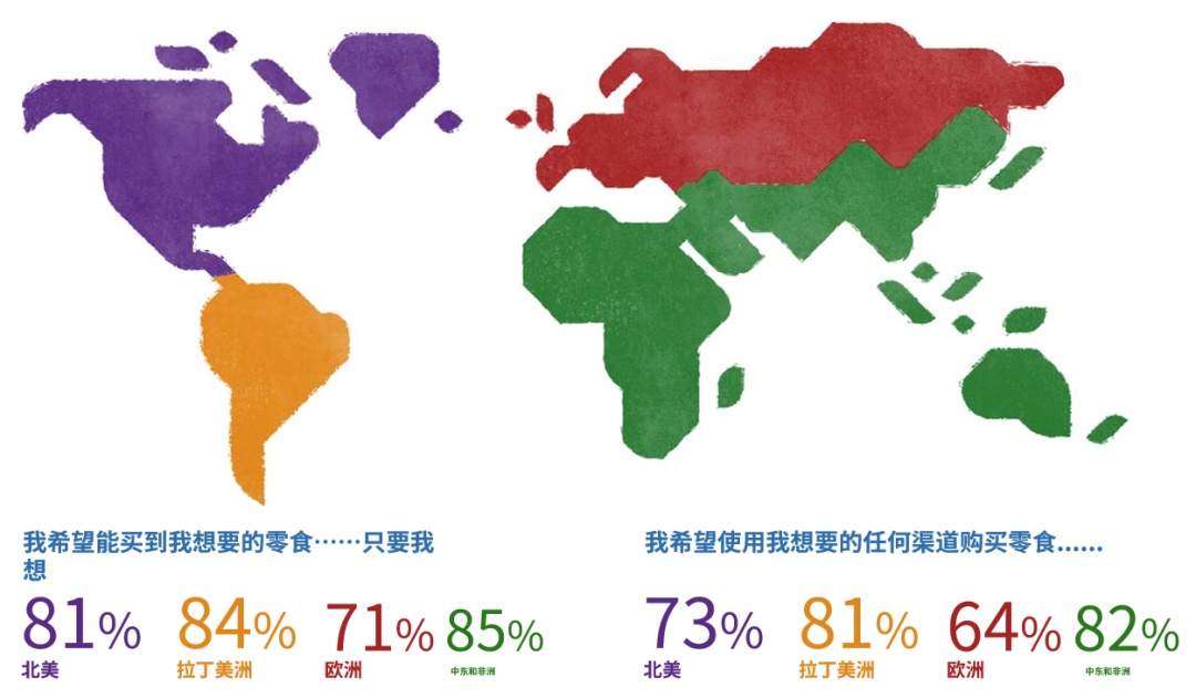 研究显示,85%的中国受访者希望能随时购入零食,91%希望购买渠道能不受限制,在这两方面中国消费者数据均高于全球平均水平。