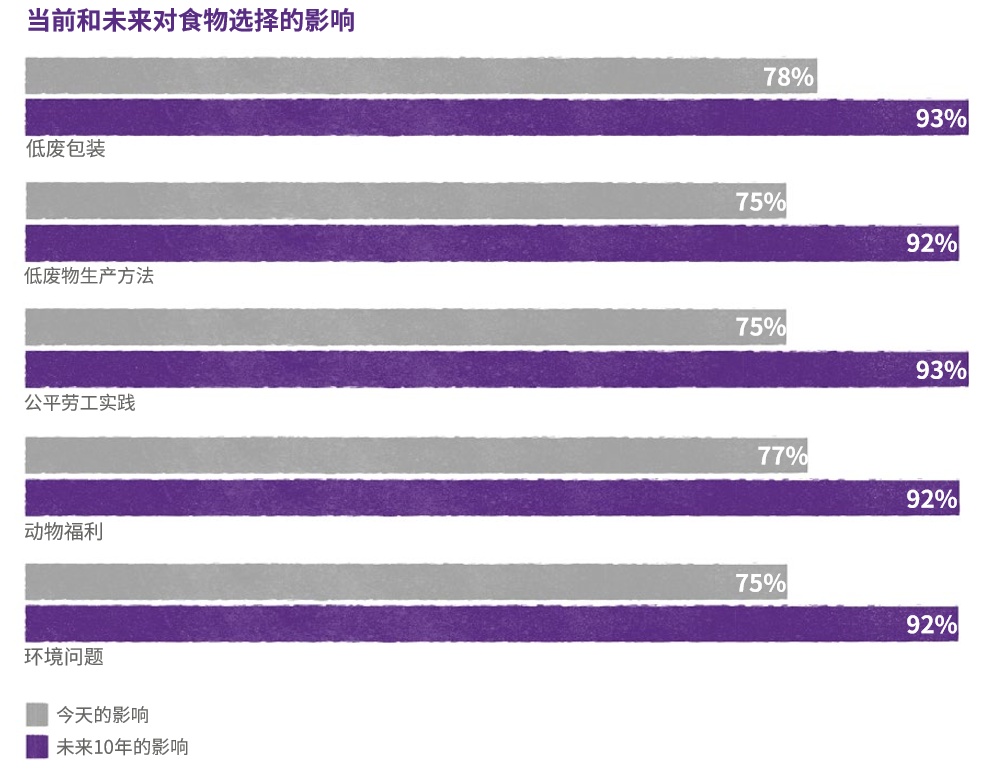 不同可持续指标对消费者选择食物的影响(当下和未来十年)