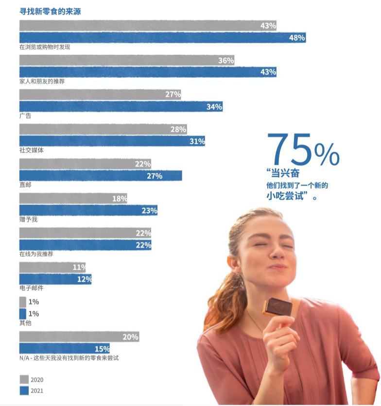 消费者也越来越多地根据兴趣社区、家人或朋友推荐、收到的礼物去寻找和尝试零食。45%的Z世代特别有可能在社交媒体上发现新的零食。