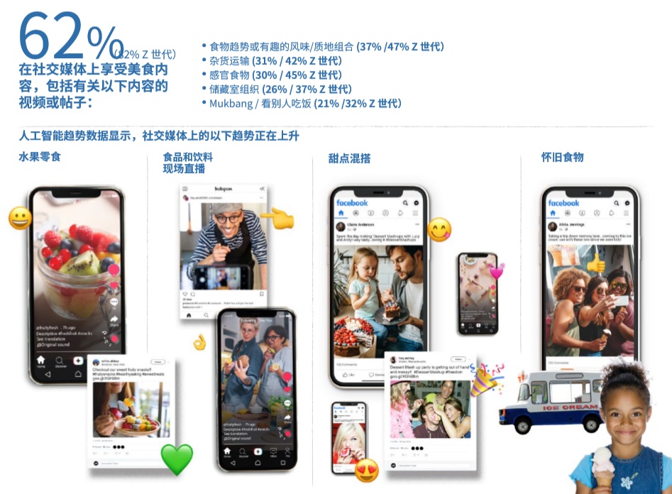62%的受访者表示喜欢社交媒体上的美食相关内容,尤其是有趣的食品趋势、杂货运输和感官食物内容。超过一半的人表示,社交媒体在过去?年中激发了他们尝试新零食的灵感——包括70%的Z世代和71%的千禧?代。