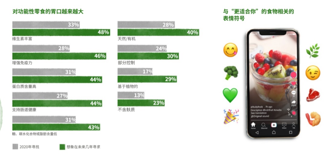 此外,功能性零食的地位也越来越重要。78%的受访者表示,他们定期吃零食是出于营养目的——比去年增加了8%。