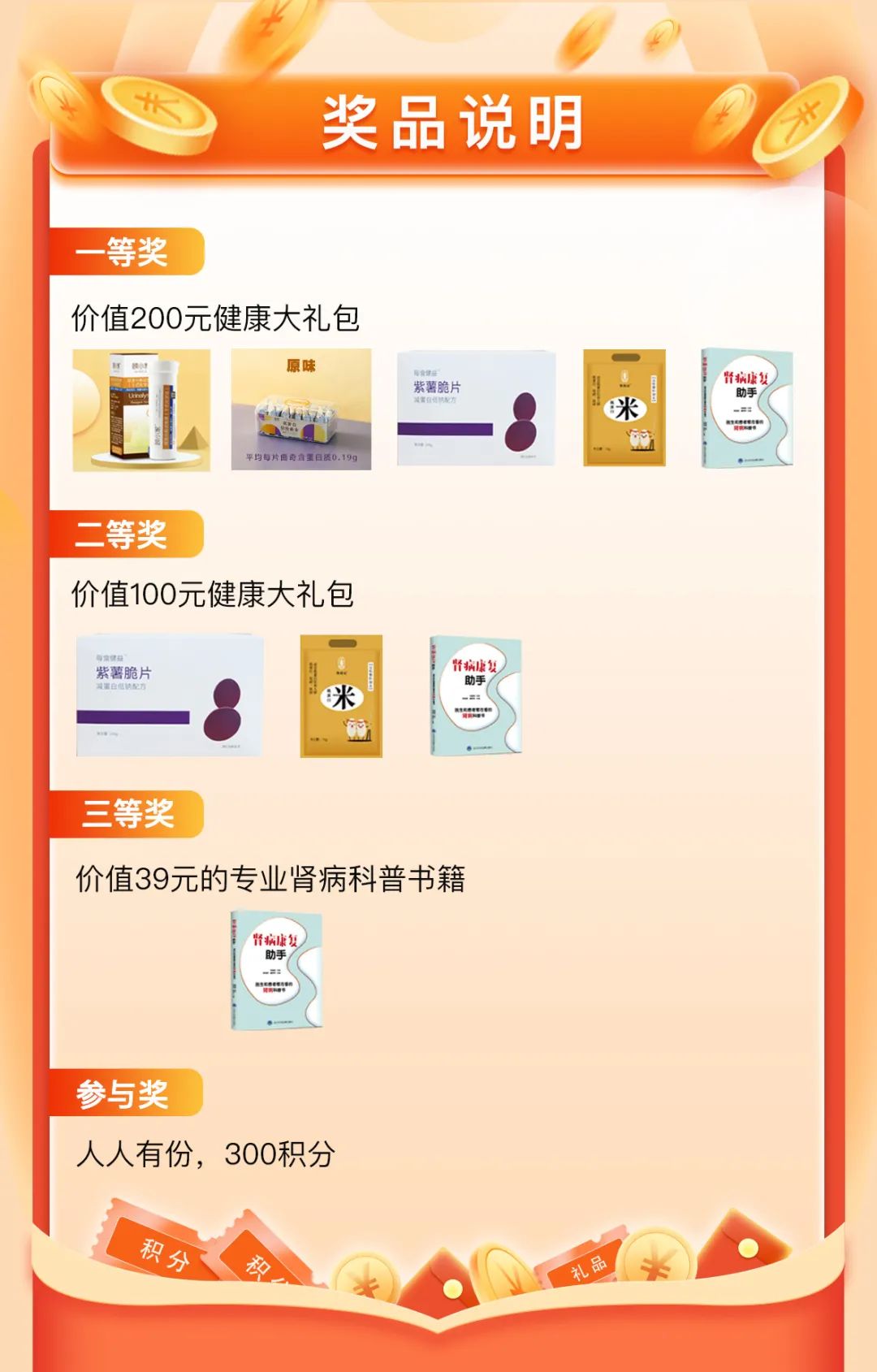 一等奖:3名,价值200元健康大礼包:顾小家尿蛋白试纸*1+低蛋白曲奇*2+紫薯脆片*1+低蛋白淀粉米1kg*1+《肾病康复助手》*1