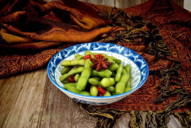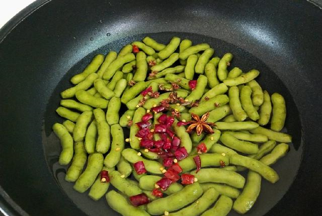【水煮毛豆】食材毛豆500克,干辣椒5克,花椒3克,八角1颗调料盐少许