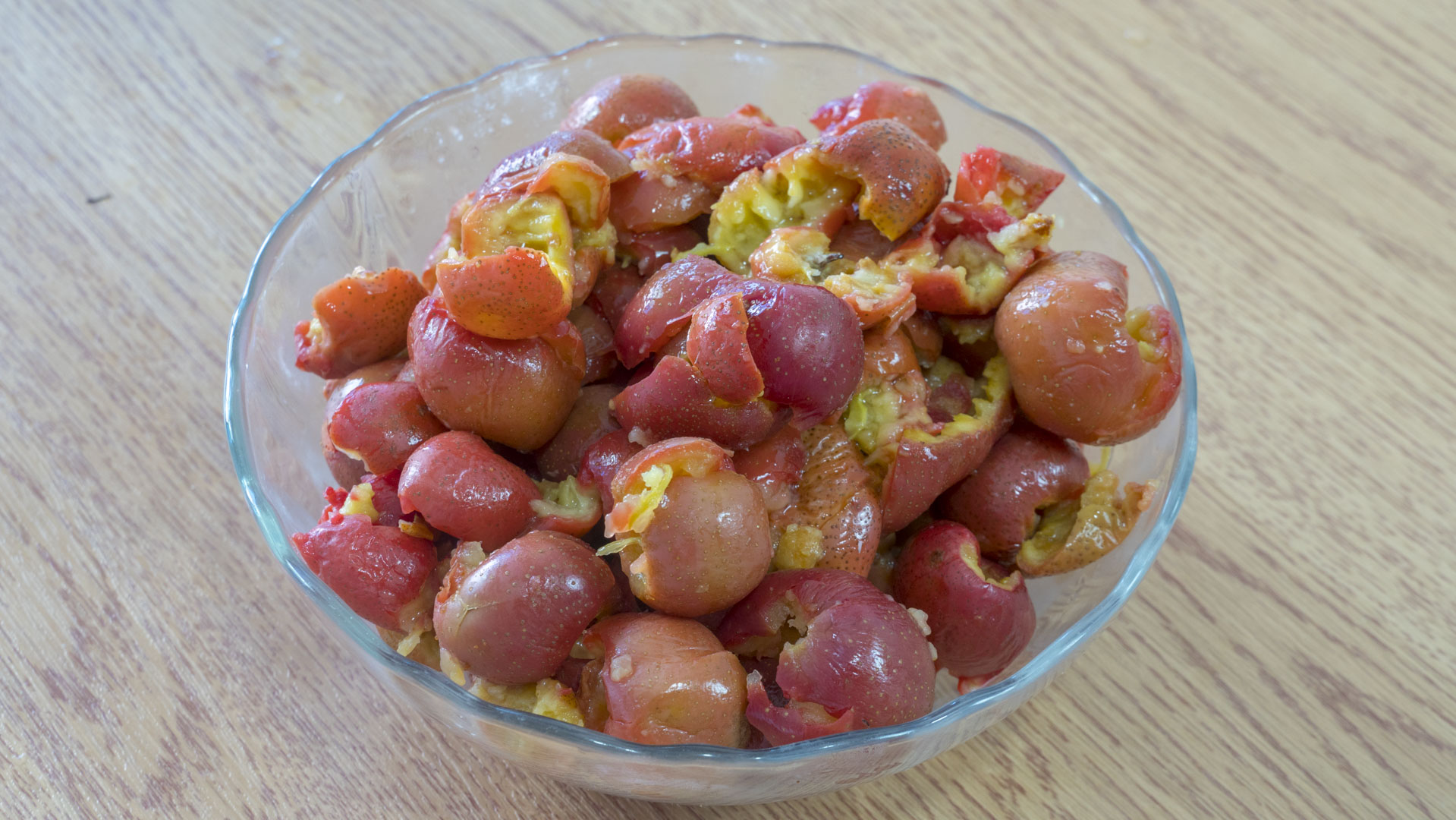 4、捞出来的山楂稍微的放一放,温热的时候就可以将核取出来,拽着柄一拉就出来了,非常快速省事儿,几分钟就全部都取完了;