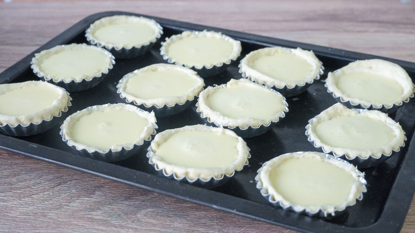 11、倒入挞皮9分满,蛋挞烤熟之后体积会比烤之前大一些,都说装太满容易溢出来,但我还是想吃一口咬下去全是馅儿的感觉;