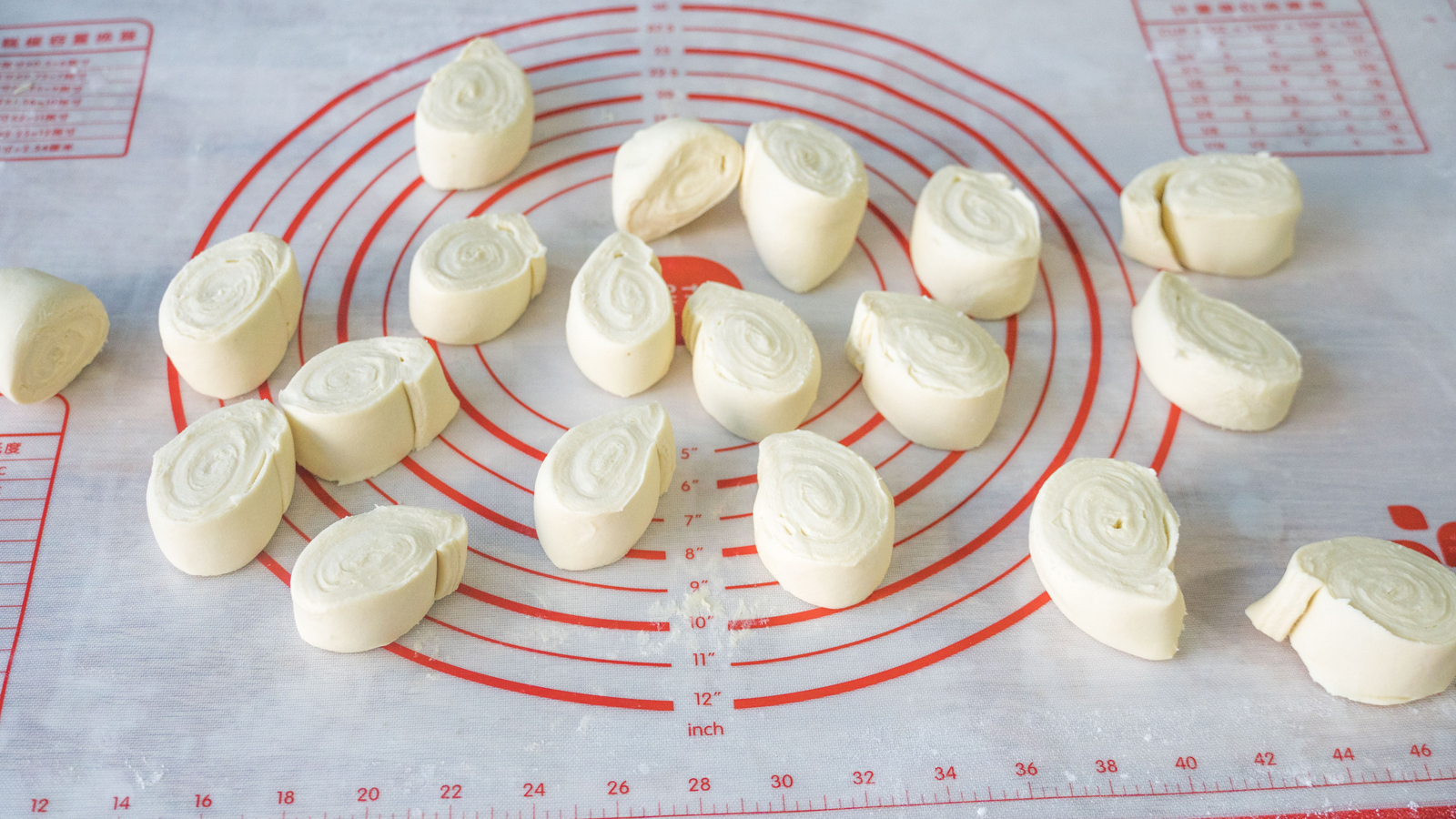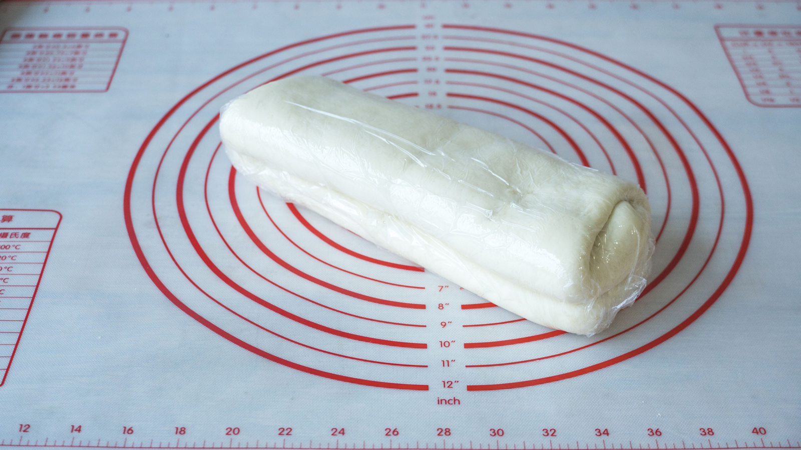 7、表面刷一层清水后从下向上卷起来,如果室温比较高,建议继续冷藏半个小时候以后再切开,每个小剂子大约是30克;