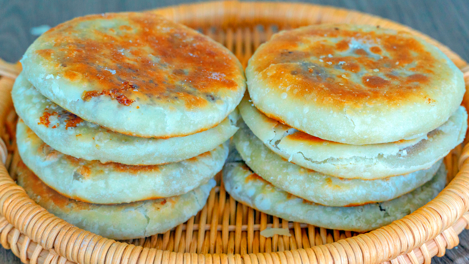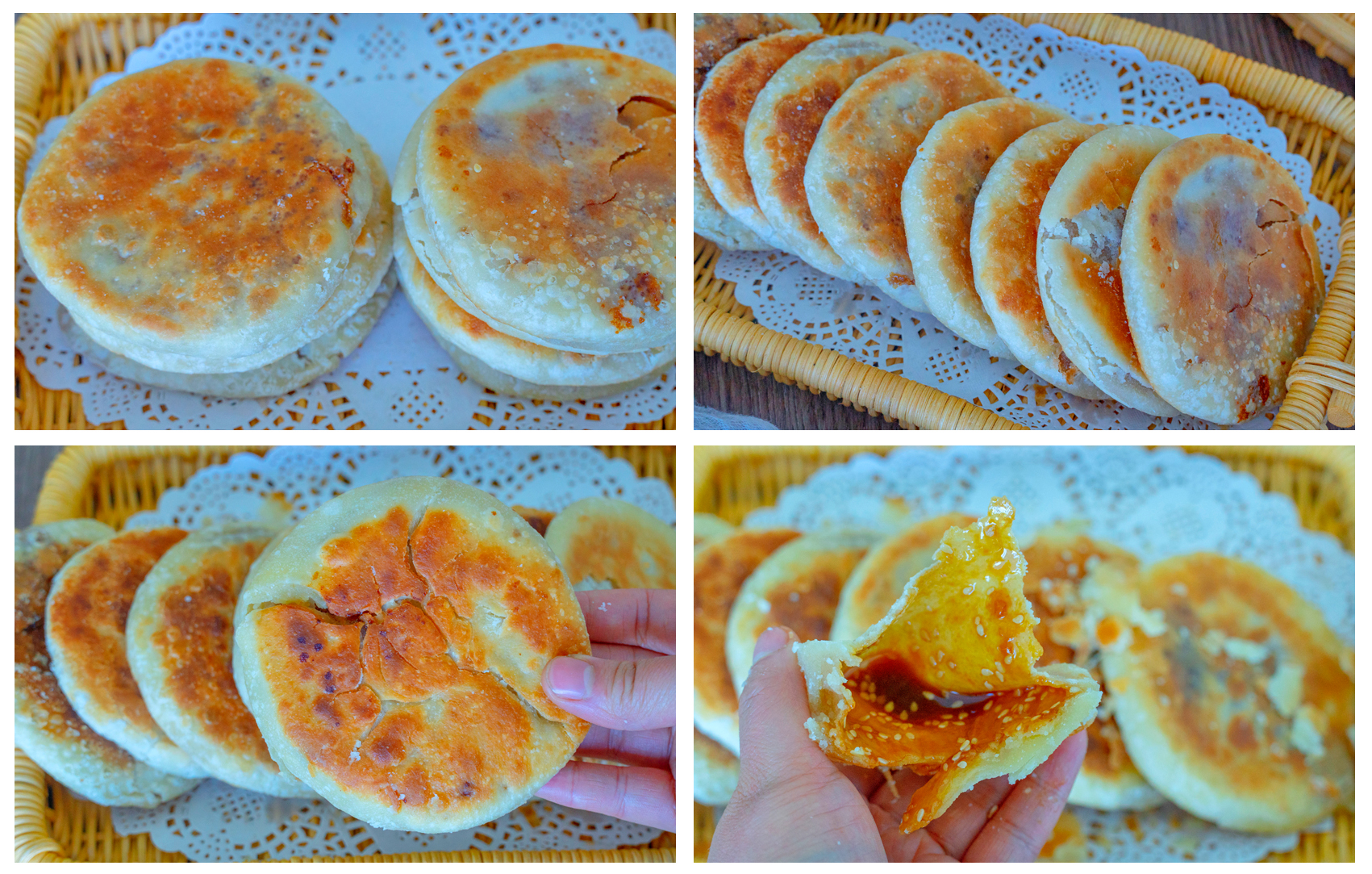8、我这个糖饼做的比较大,翻了3次面才出锅,其实还是比较好熟的,没有擀破的饼在烙的时候也会鼓起大泡,呈现空心的状态,酥脆到掉渣的糖饼就可以开动啦;