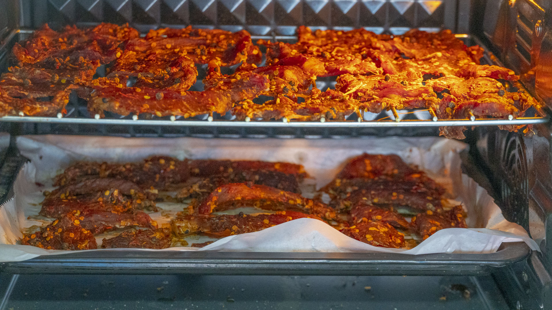8、第二天我们再来看一下,猪肉全部风干了,已经完全脱水了,拿起来硬邦邦的。
