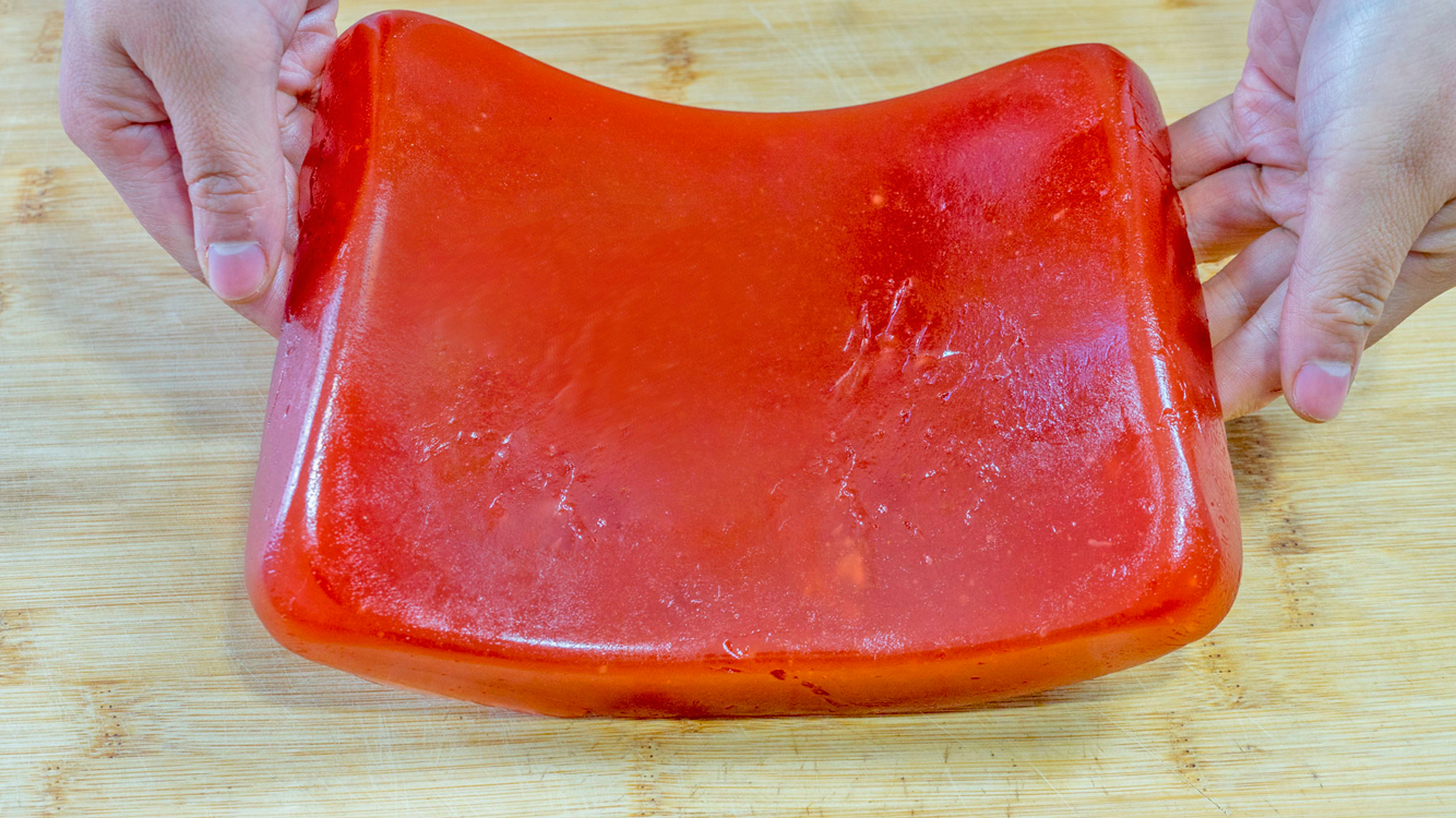11、待凉透后放入冰箱冷藏2个小时,从冰箱取出来就很容易脱模了,都没有倒扣,用手轻轻一掰就全部出来了,最后就可以切块儿啦。
