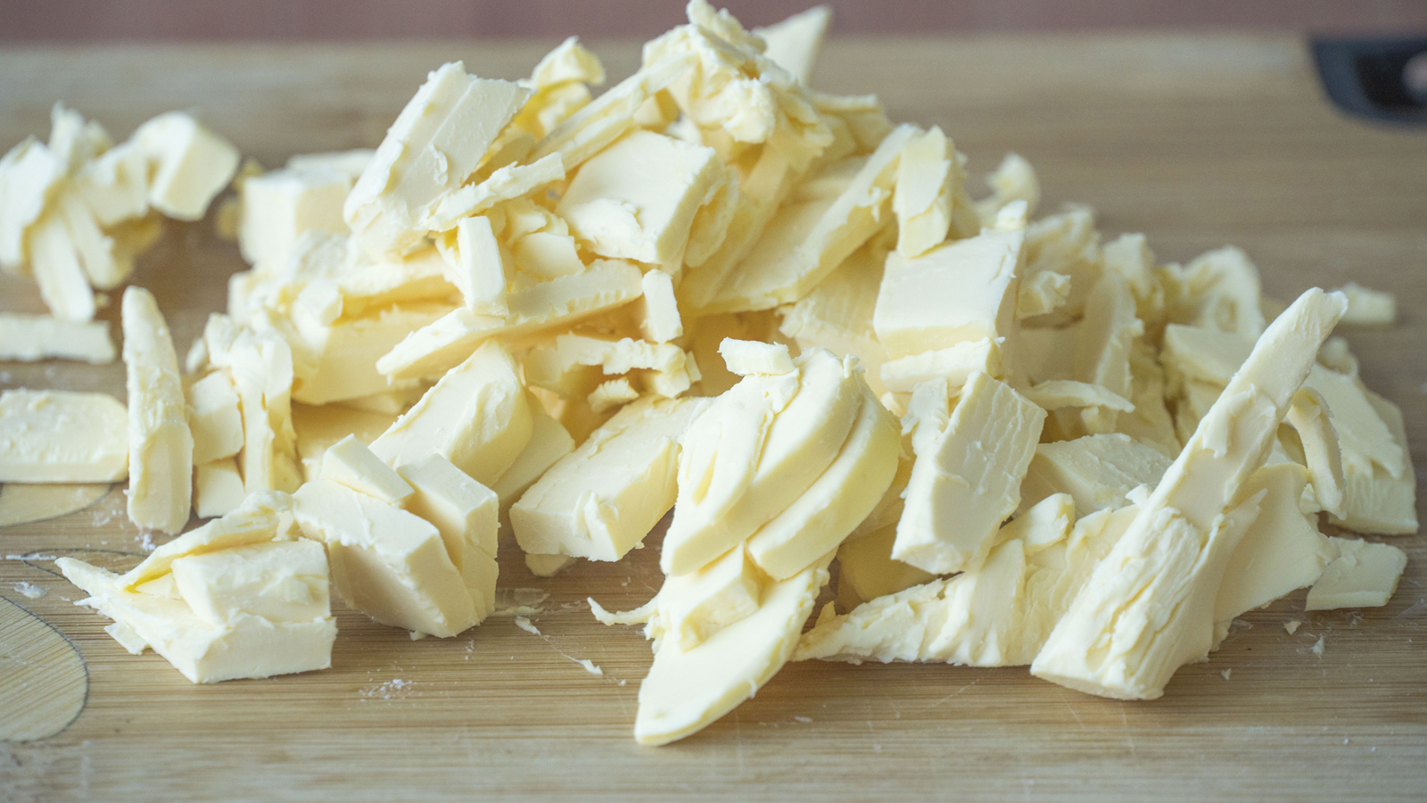 蛋挞皮:黄油40克、盐6克、中筋面粉300克、水150毫升、黄油150克(融化的黄油10克刷模具)