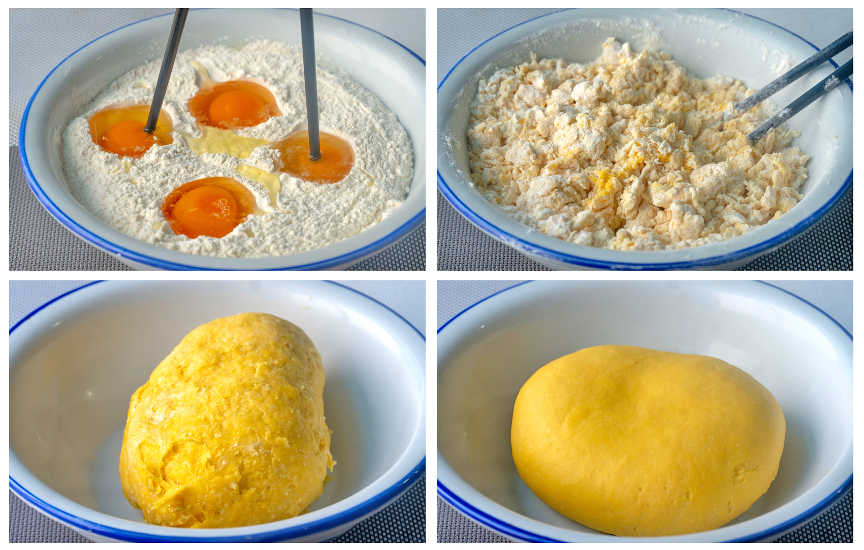 1、先来和面,面粉300克,白糖20克,酵母3克,鸡蛋4个,没有干面粉后加20克食用油;上手揉面,基本的揉成一个面团后先醒10分钟,让面粉和蛋液充分地混合在一起后再揉光滑,醒发至两倍大;