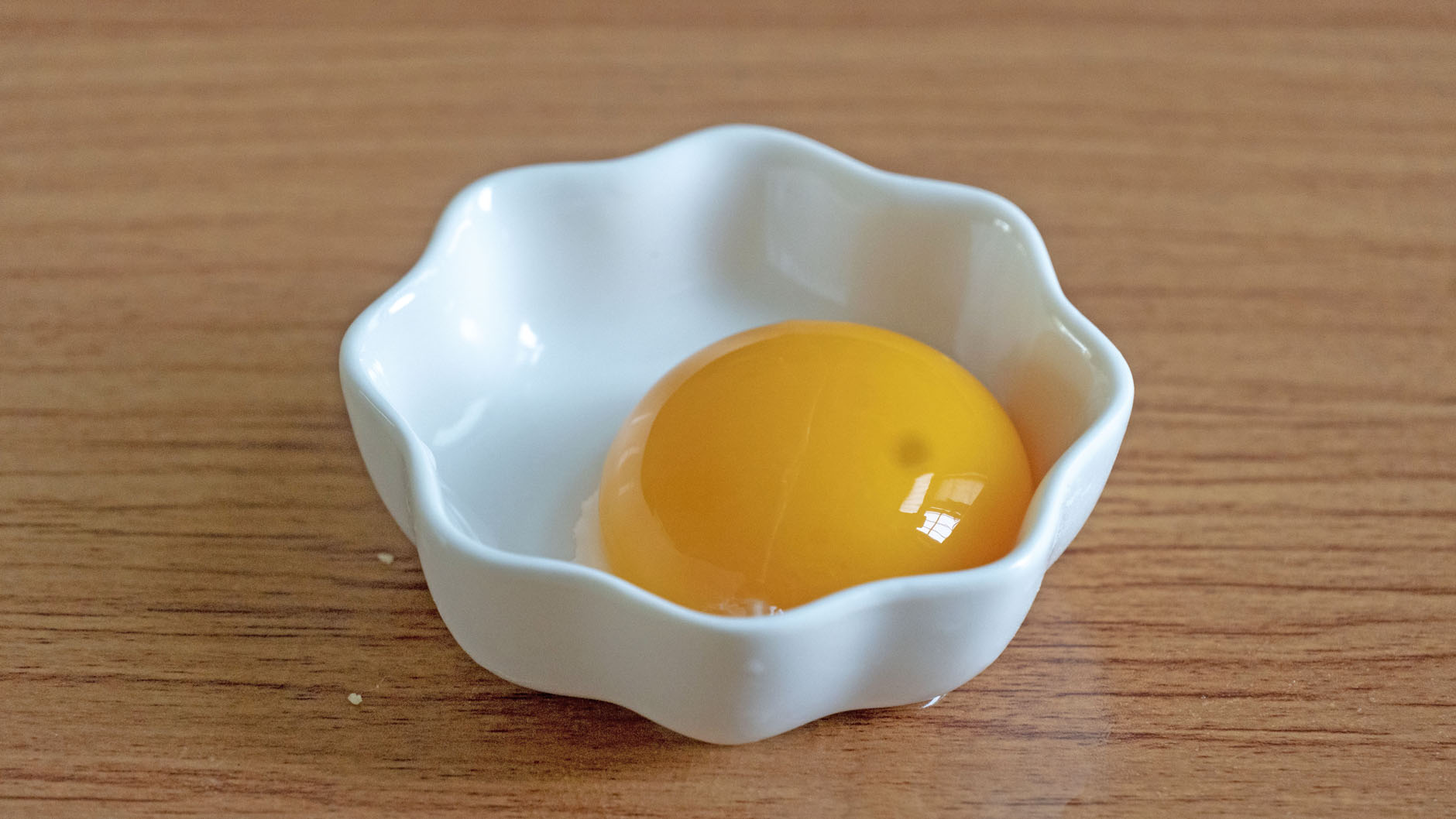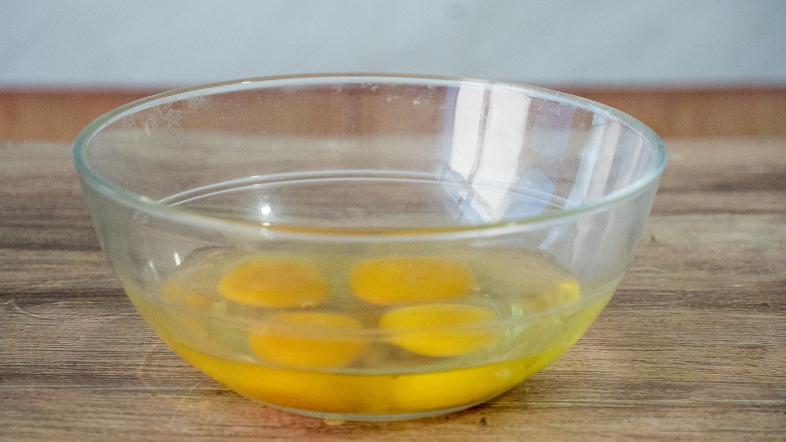3、全部做好后碗中再打入1个鸡蛋,蛋清蛋黄分离,只留取蛋黄搅散备用;