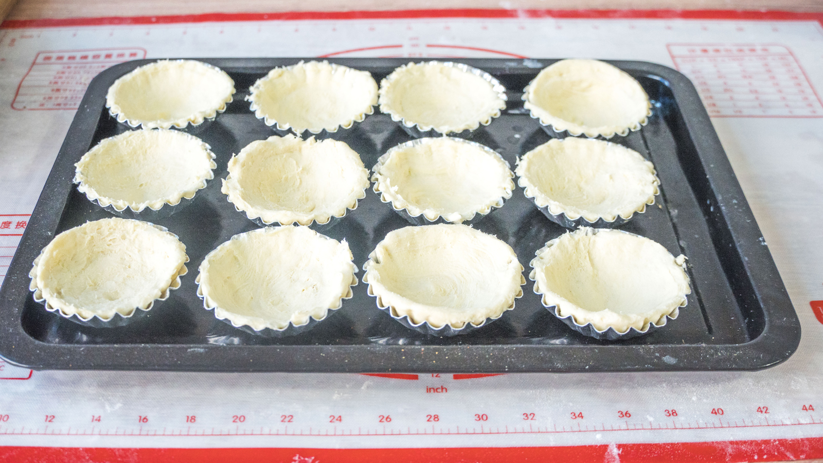 8、蛋挞模具刷一层薄薄的黄油,将面团放进去后用两个大拇指往边缘按,让面团填满整个模具,底部要薄一点,不然吃起来不够酥,边缘要比模具高出来一点点,塔皮部分就完成了;