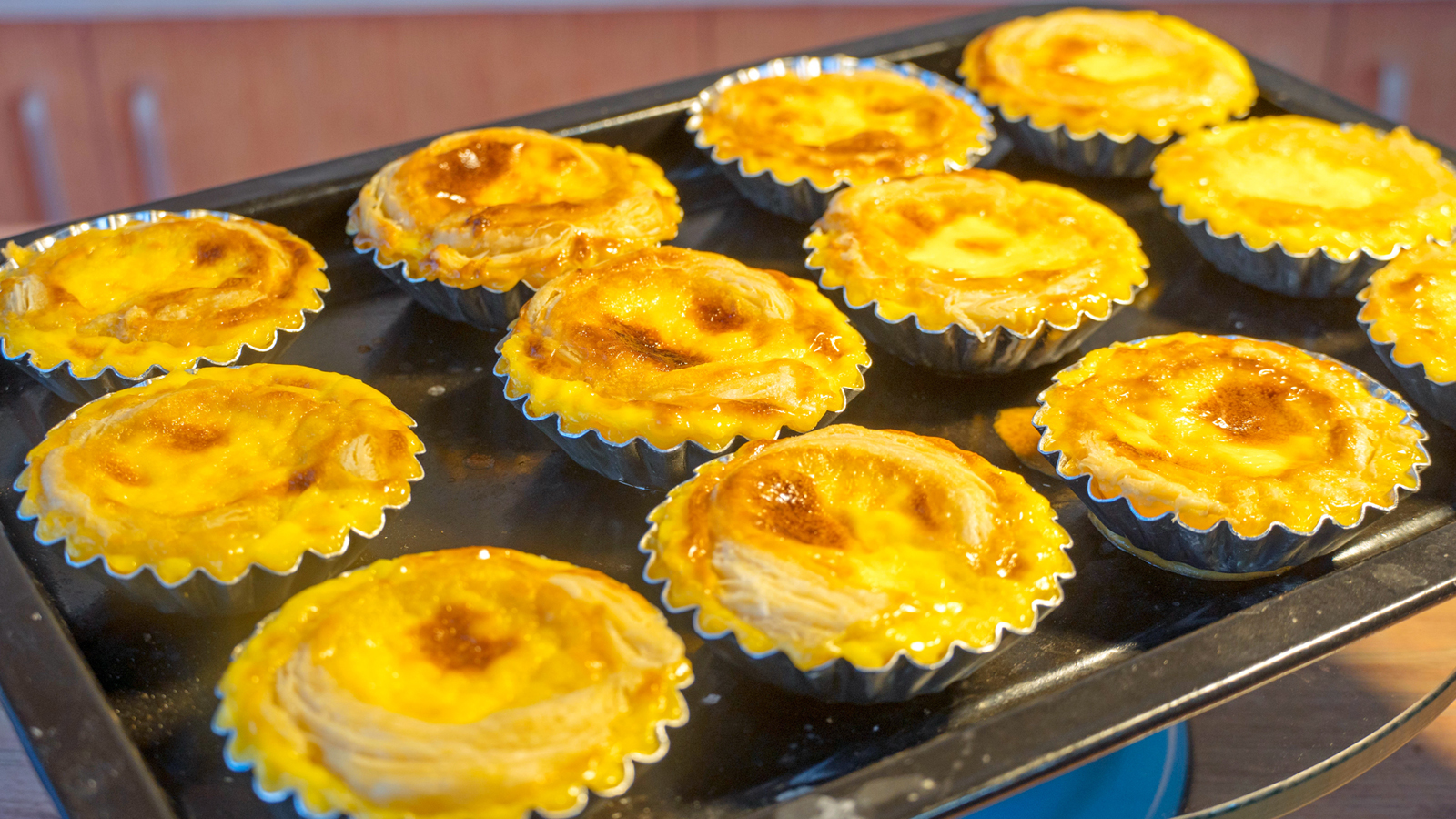 刚出炉的蛋挞是鼓鼓的,稍微的放凉一会儿再吃,外焦里嫩,非常的香