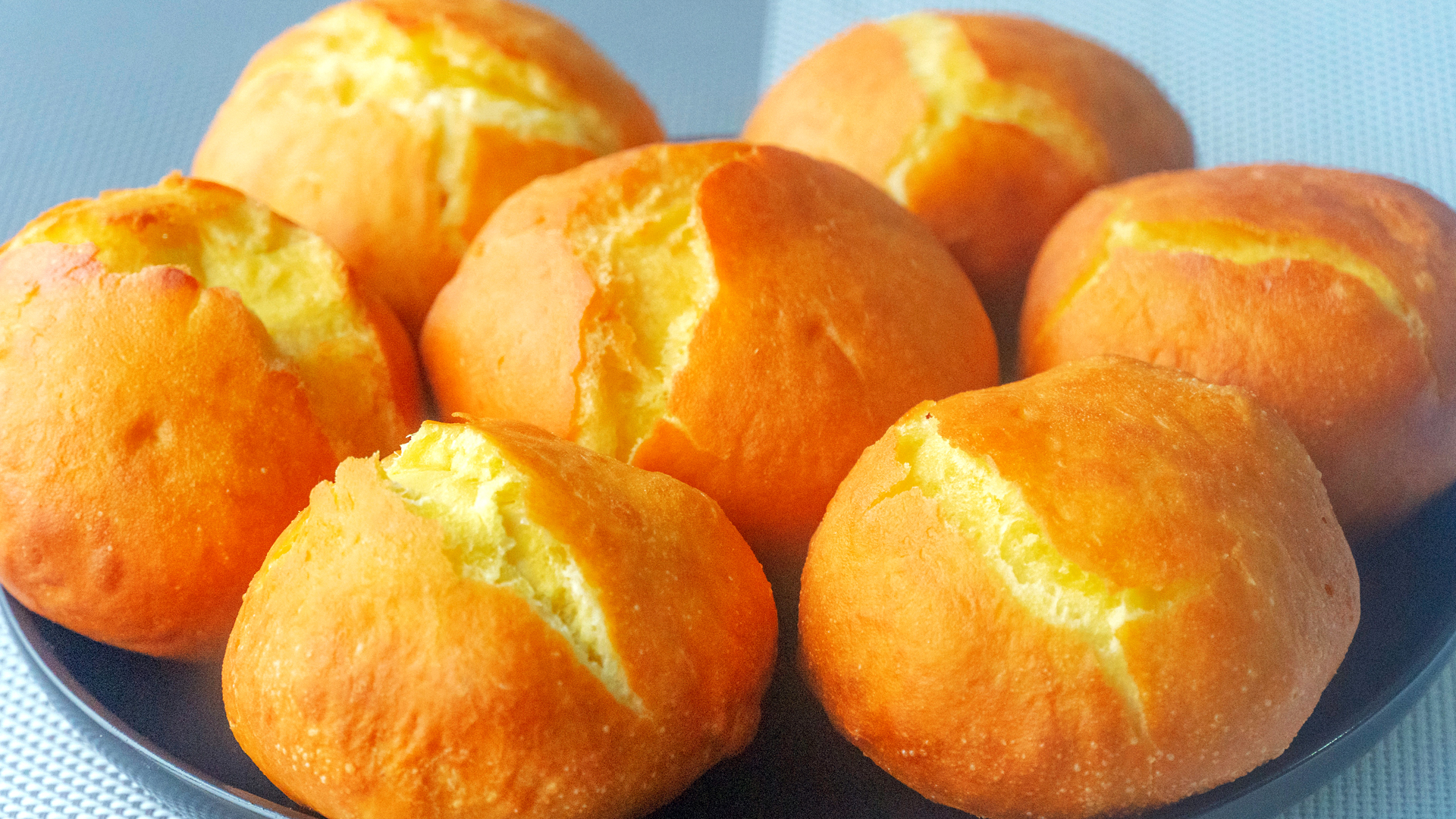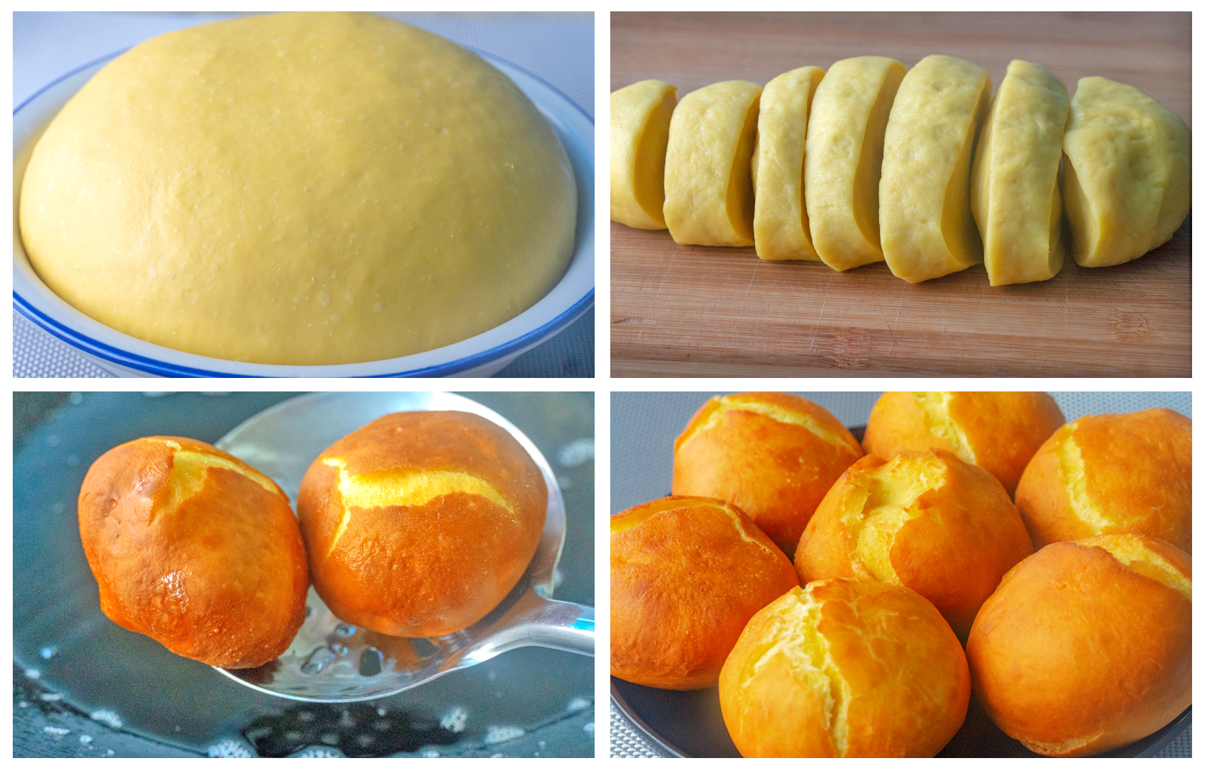 5、表面已经轻微裂开了,说明这个小面包已经熟了,捞出来控油,我们的小面包就做好啦,表皮脆脆的,里面是非常柔软细腻的。