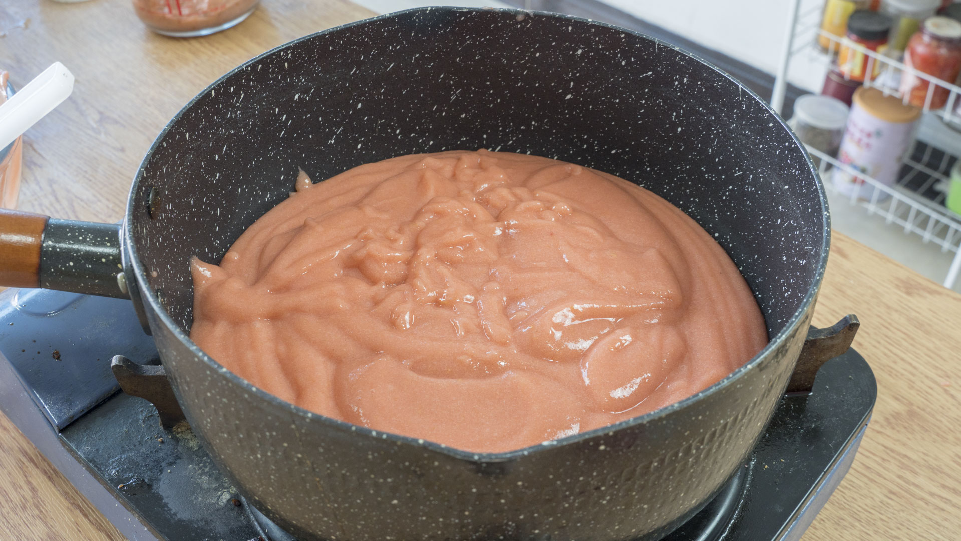 8、全程开中小火熬煮,一直要不停的搅动,否则煮沸的山楂泥会像岩浆一样乱崩,慢慢的会变得越来越浓稠透明;