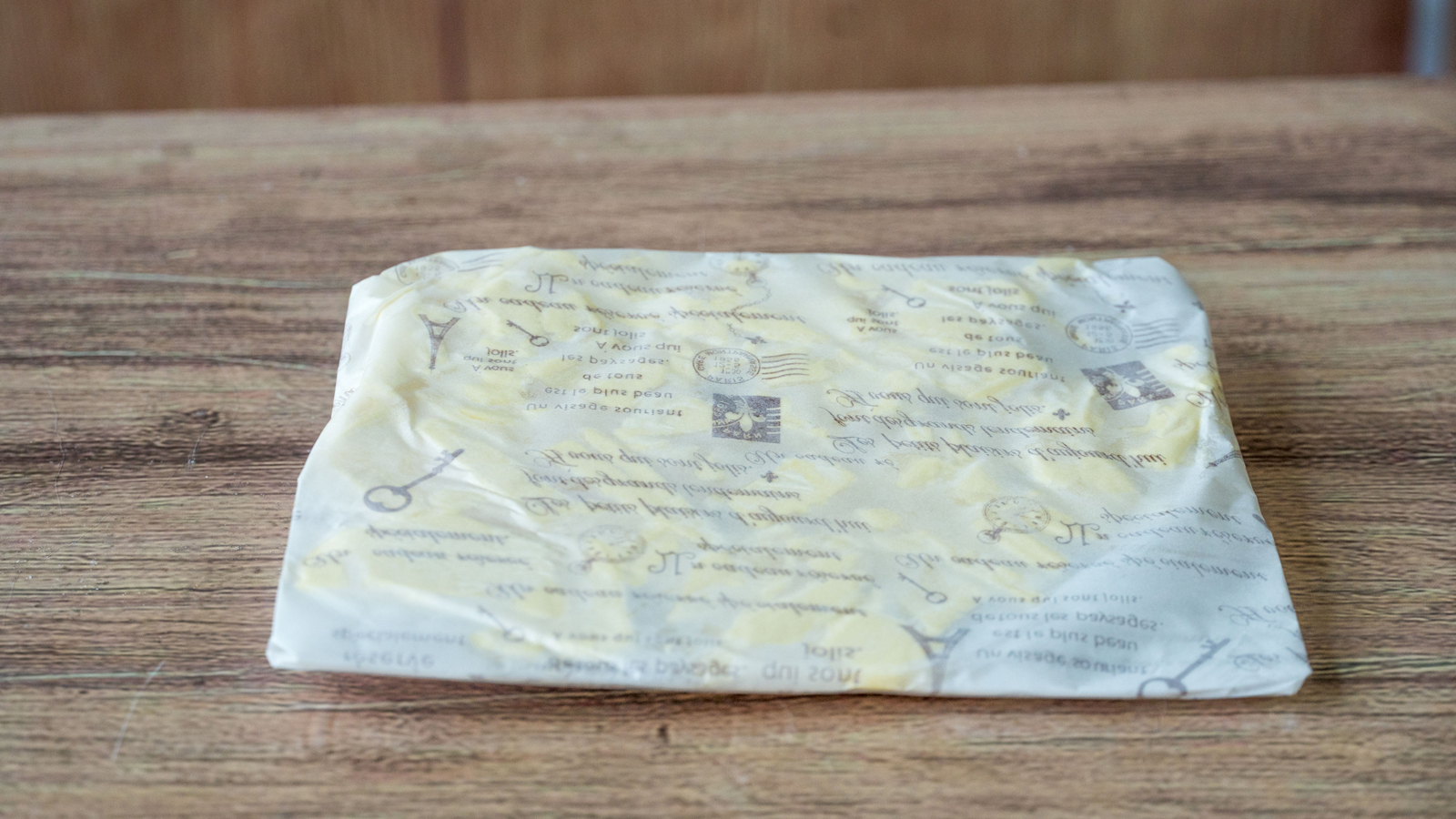 3、150克黄油先来切片,再稍微的改小一点,还有就是切片的时候不要切太厚,擀的时候方便操作,放到油纸中间包起来后开始擀,尽量擀到厚薄一致,最后是一整块儿就可以了,放冰箱冷藏;