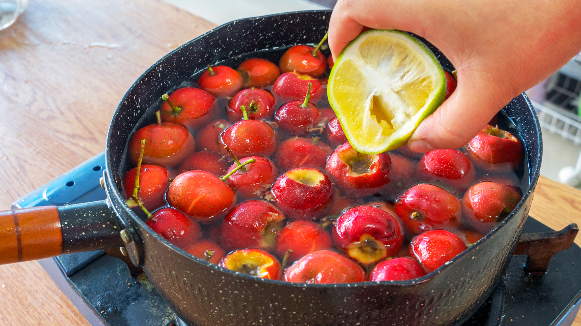 3、锅中的水烧开后把山楂倒进来煮,再来半个柠檬挤出柠檬汁,这样可以防止山楂氧化变黑,大火煮3分钟就可以了,煮太久的话颜色会掉,做出来成品就不好看了;