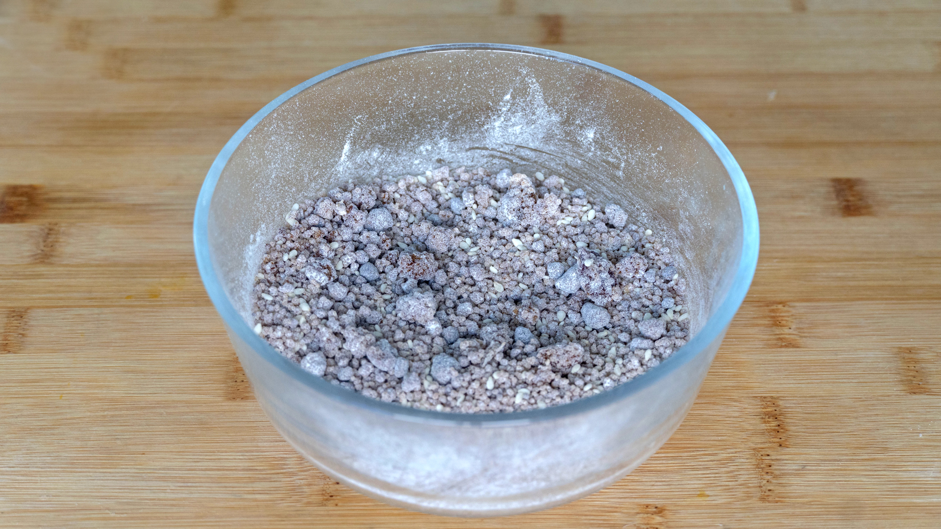 3、再来做一个我自己特别爱吃的糖馅儿:红糖80克、面粉20克、白芝麻10克,拌匀后就是一个简单又香甜的糖馅儿了;