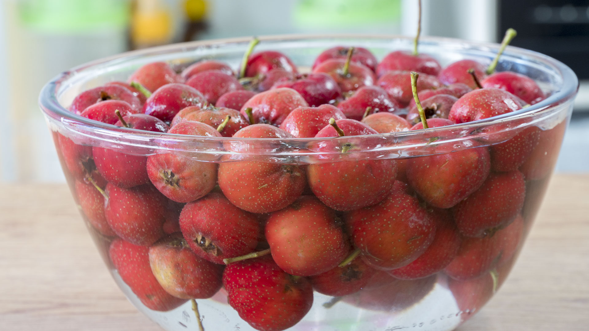 1、准备两斤新鲜山楂,先往水里加一勺盐,把山楂都倒进来泡5分钟;