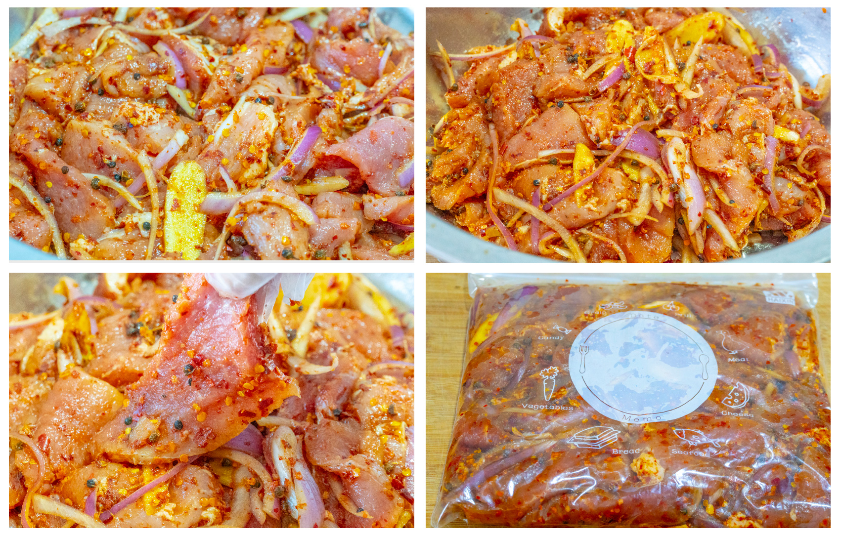 5、这个调料做出来是麻辣口味的,非常的香,充分地抓拌均匀后腌制一夜。