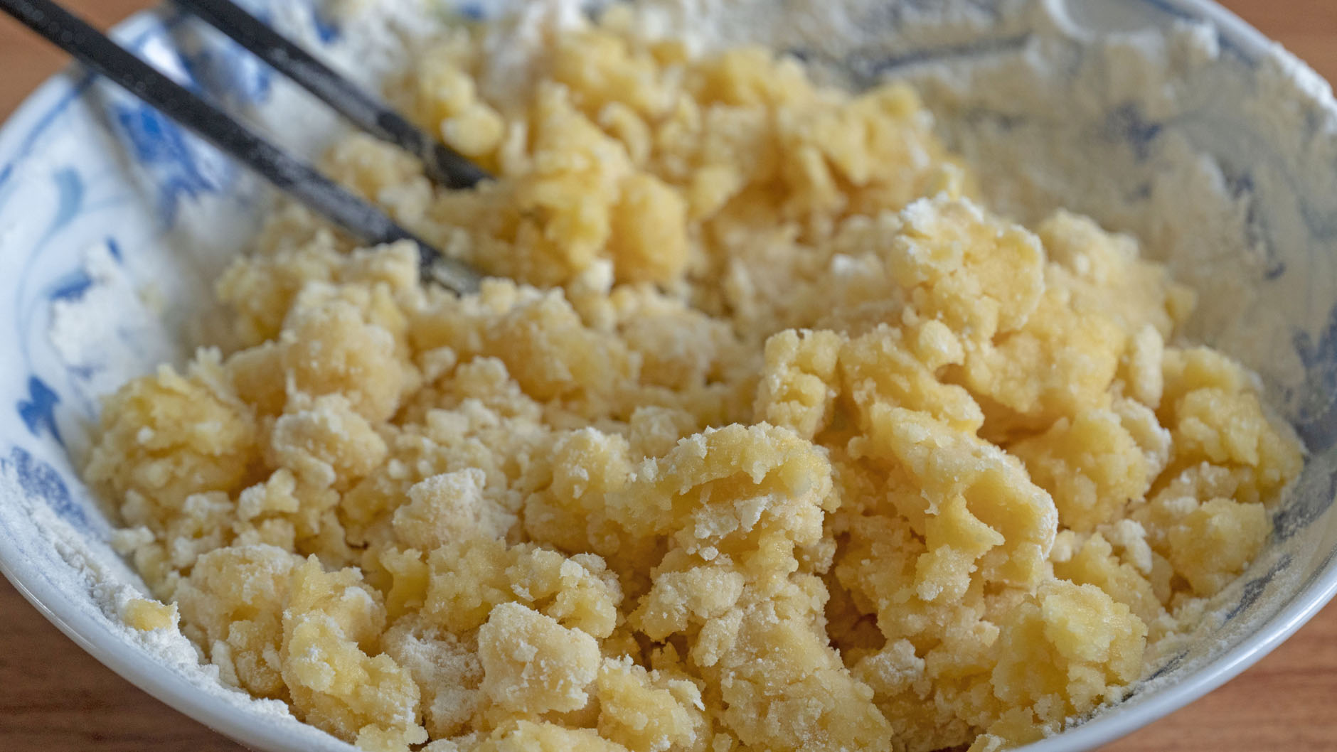 盐6克、中筋面粉300克,混合均匀后用手搓成颗粒状,很多人做挞皮都是用低筋粉配一点高筋粉,其实家庭制作用中筋面粉也是可以的,同样做出来也很好吃;