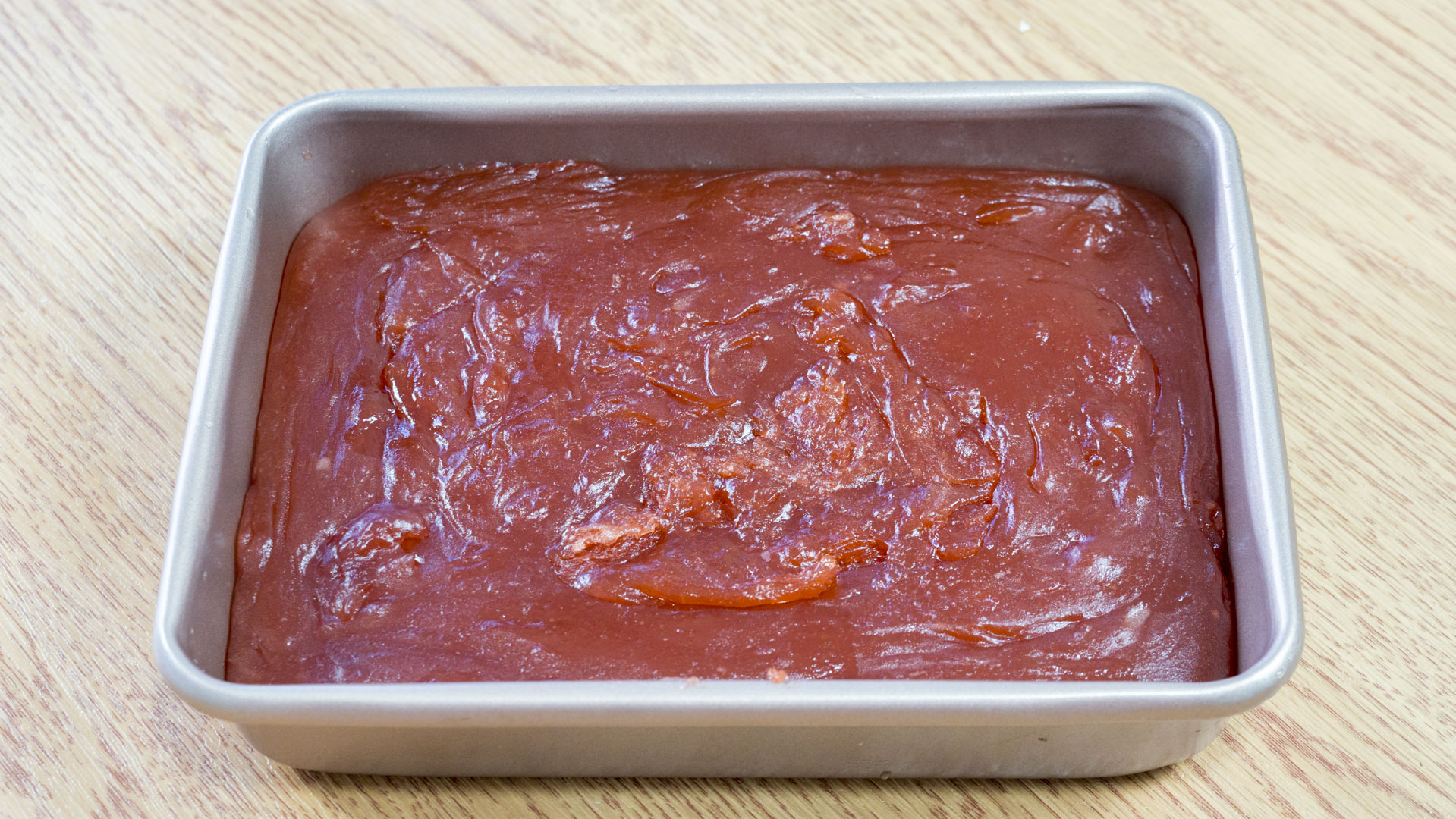10、趁热倒入刷了油的模具中,轻震几下让它更均匀一些,表面用铲子再轻轻地抹平;