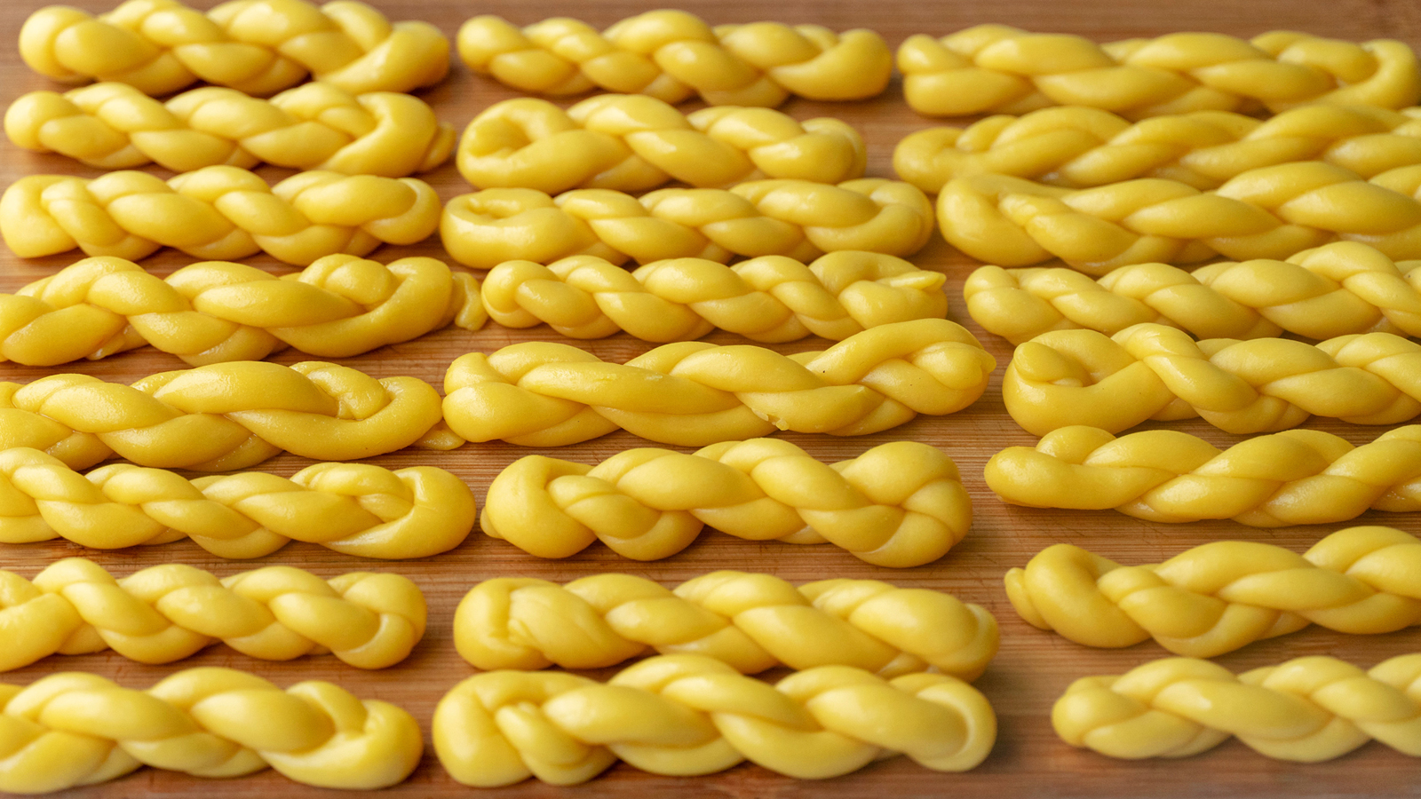 3、我们现在来搓面条,先搓成细细的长条,两头对折起来,一只手捏住一端,另一只手给这个面条上劲儿,劲儿满了再对折,形状就差不多出来了,再拧几圈儿,最后把小尾巴捏进另一个里面,防止炸的时候开裂,我们的小麻花就做好了;