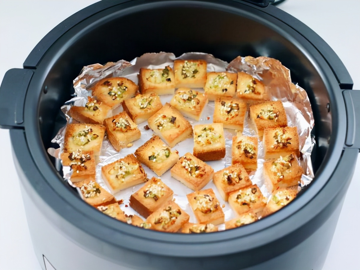 步骤5:咱用到的是空气炸锅,也可以用烤箱,空气炸锅是要提前预热的这样咱做的时候就不用等待。在炸锅里油纸要铺好,然后把吐司块放进去。