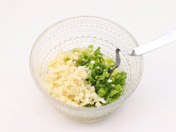 步骤3:黄油全部融化了之后,就把大蒜和小葱碎末全部都放进去,和黄油融合,搅拌的匀乎些。