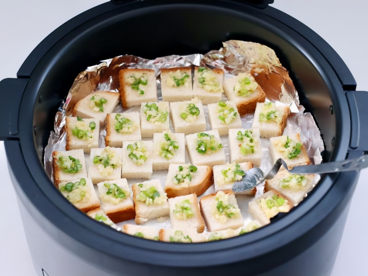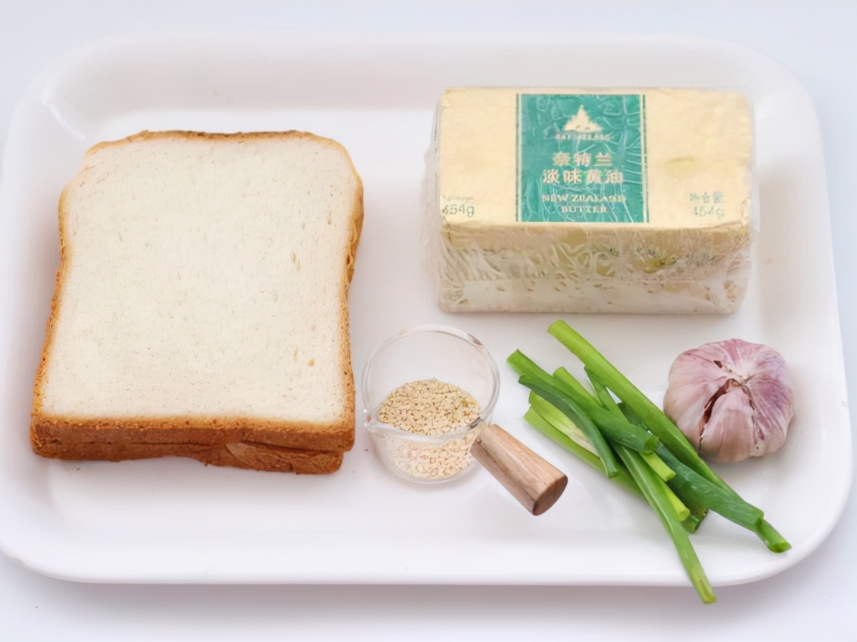 【烹饪材料】吐司2片,大蒜5瓣,小葱1根,芝麻5克,黄油20克
