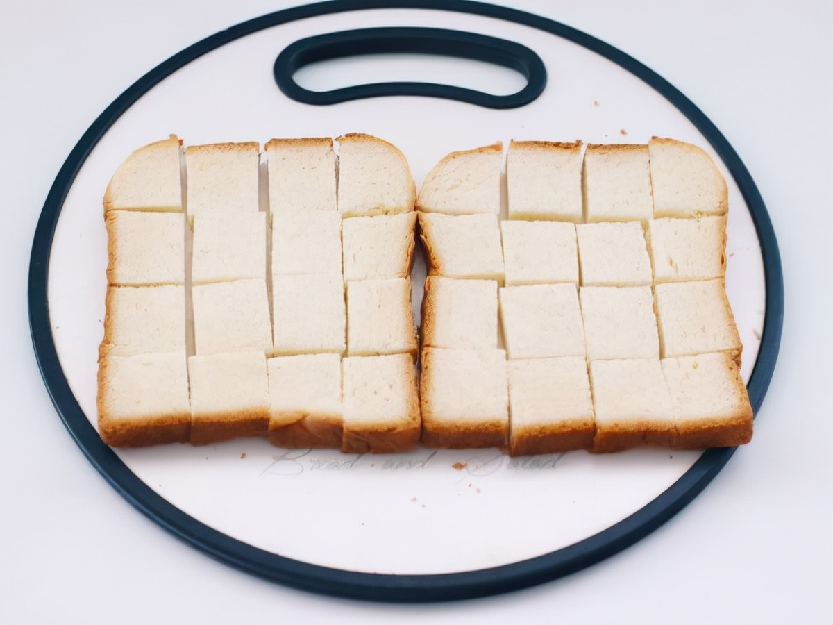 步骤4:这时候开始准备吐司,把吐司切成小块块,均匀的小四方。
