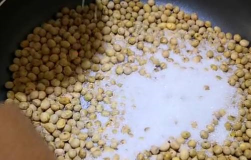 开小火慢炒,不停的翻动,炒到豆子都爆皮,豆子扑出扑出都开裂了.还散发出香味,就可以了.加白糖,白糖可以根据自己的口味加多少.