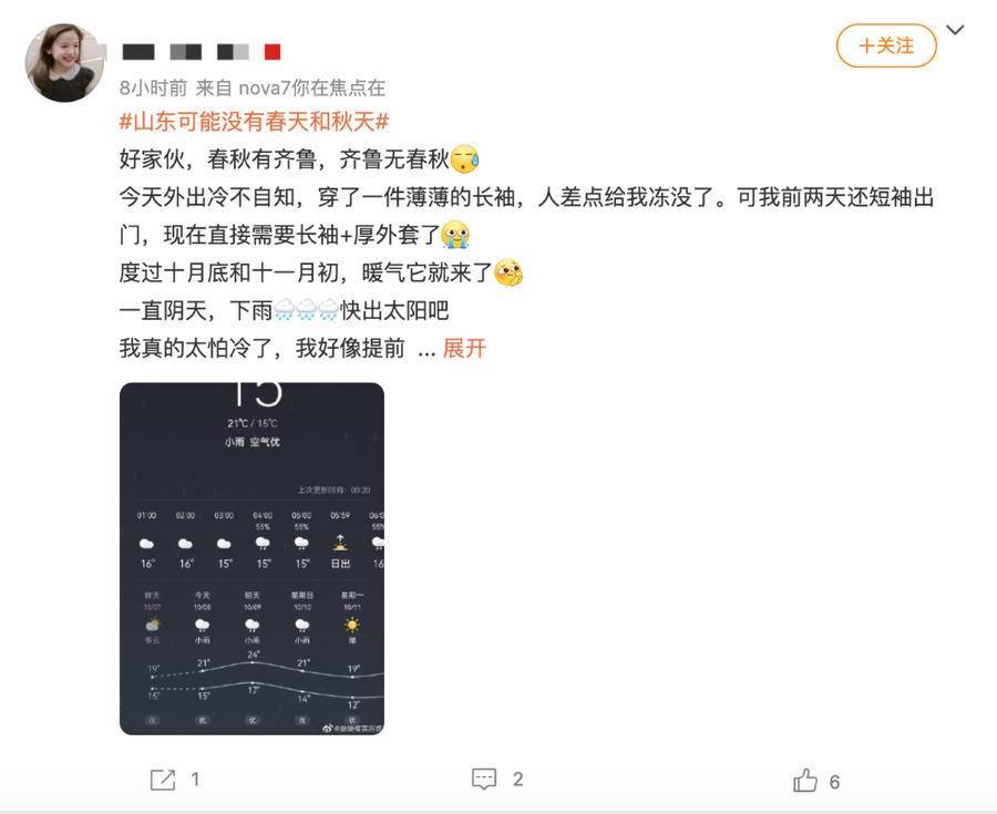 国庆假期结束,十月初的山东冷出了过冬的感觉?有网友感叹,上一次过春秋,还是战国时期吧!