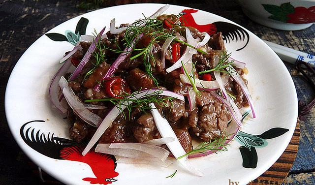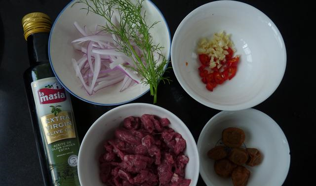 梅子洋葱拌牛肉材料:牛肉150克,蜂蜜梅子6个,洋葱20克,朝天椒1只,鲜茴香5克,橄榄油20克,蒜5克辅料:香醋2匙,酱油1匙,糖1小匙,蜂蜜1匙