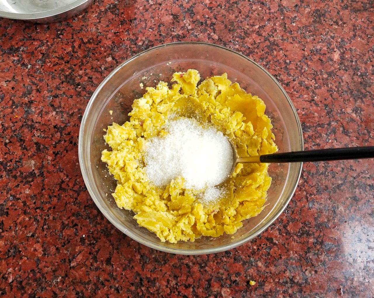 2、已经熟透的红薯我们拿出来先放在一边凉一下,然后把红薯的皮都剥掉。准备大一点的碗,把剥好皮的红薯放进碗里,用勺子或者手把红薯弄成泥状,然后加入适量的白糖,把白糖和红薯泥充分的拌匀。