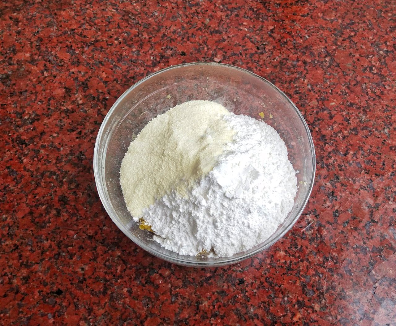4、再把糯米粉,奶粉倒进碗里然后再继续搅拌,拌匀之后我们就可以下手了,用手揉成一个大面团。