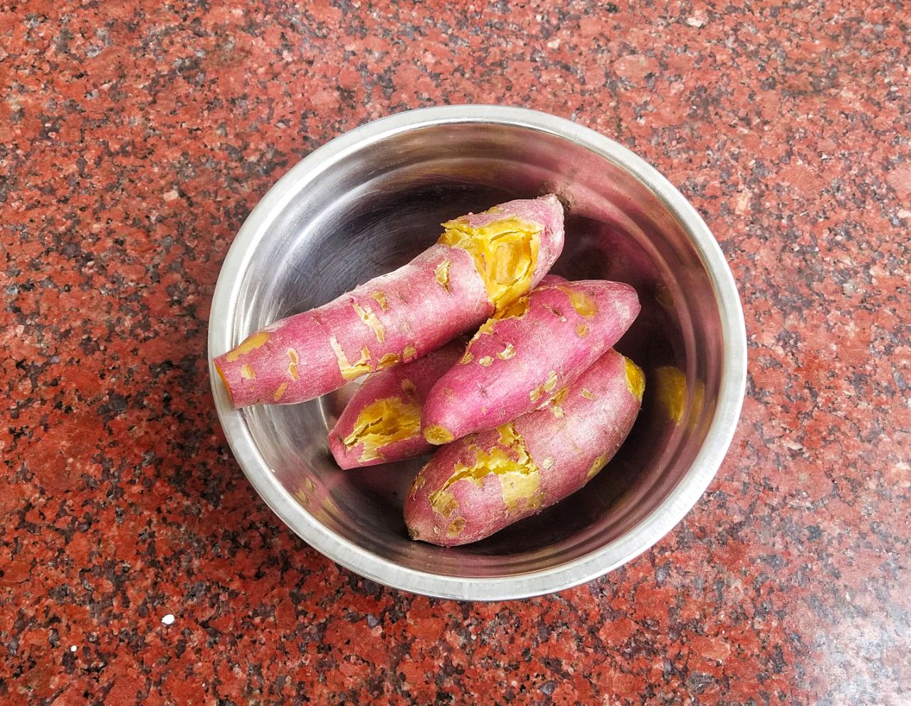 1、把需要用到的食材都提前准备好。红薯我们可以挑一些大个头的比较规整的,这样的红薯比较甜一些。洗干净之后我们把红薯放入蒸锅里面先蒸20分钟左右,完全蒸熟以后再拿出来,没熟的话就延长时间继续蒸。