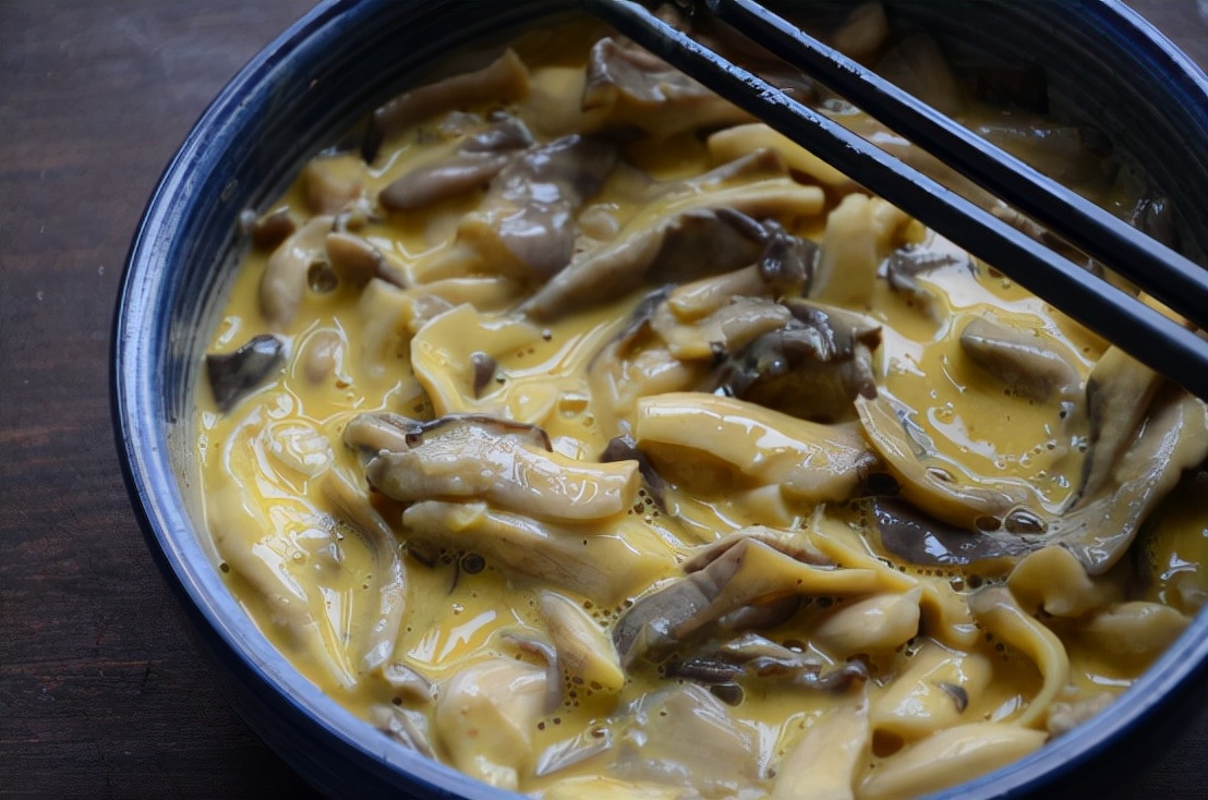 4、等到蛋糊调好之后,将腌制好的平菇放进去,用筷子拌一下,这样平菇上都能包裹上蛋液了。